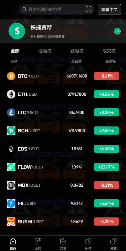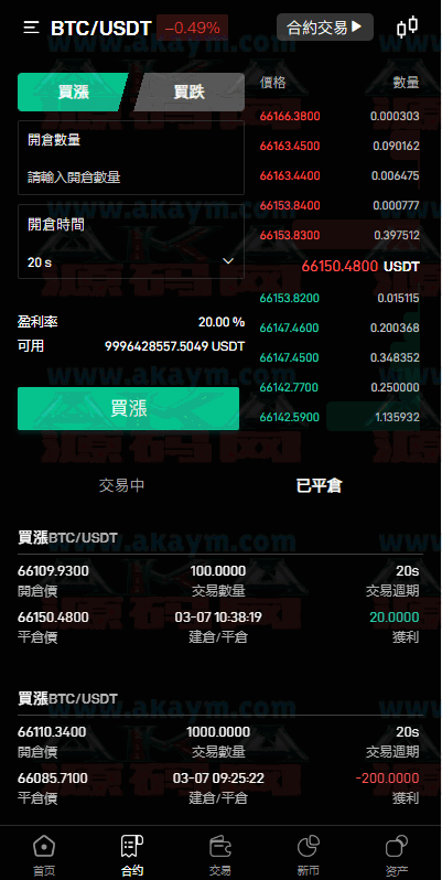 系统功能很全了,ui也不错功能支持:币币交易、合约交易、秒合约交易、c2c、认购、理财等