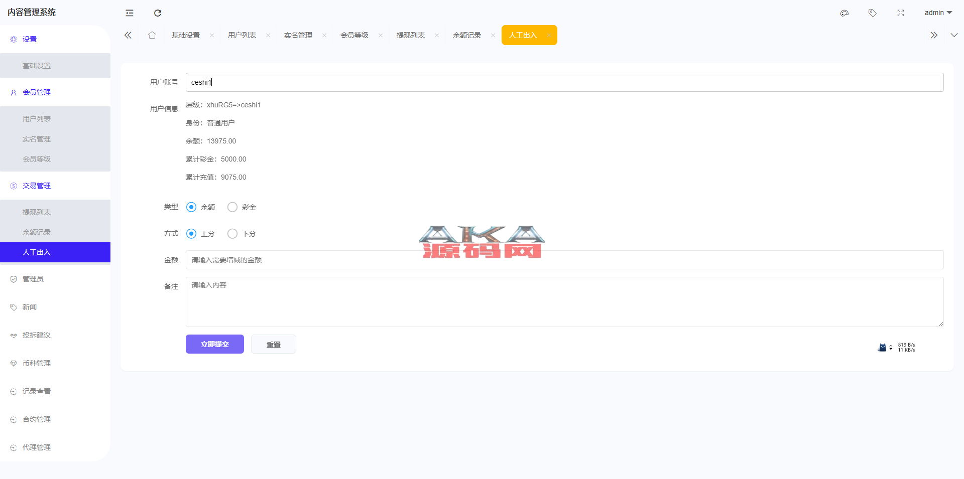 4.后台增加手动上分下分功能