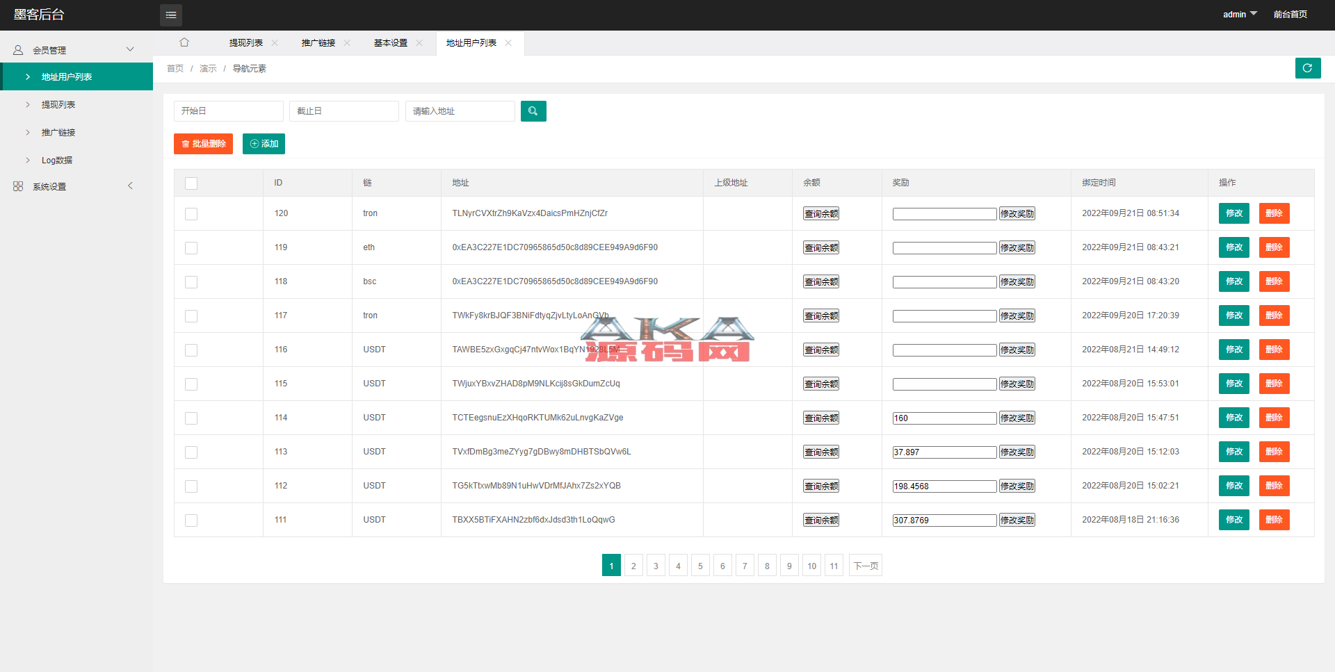 系统后台比较简洁支持BSC、ETH、TRX三链授权秒U 只有源码没有配置授权的教程,源码能不能运营不清楚 声明:本站所有文章,如无特殊说明或标注,均为本站原创发布。任何个人或组织,在未征得本站同意时,禁止复制、盗用、采集、发布本站内容到任何网站、书籍等各类媒体平台。如若本站内容侵犯了原著者的合法权益,可联系我们进行处理。